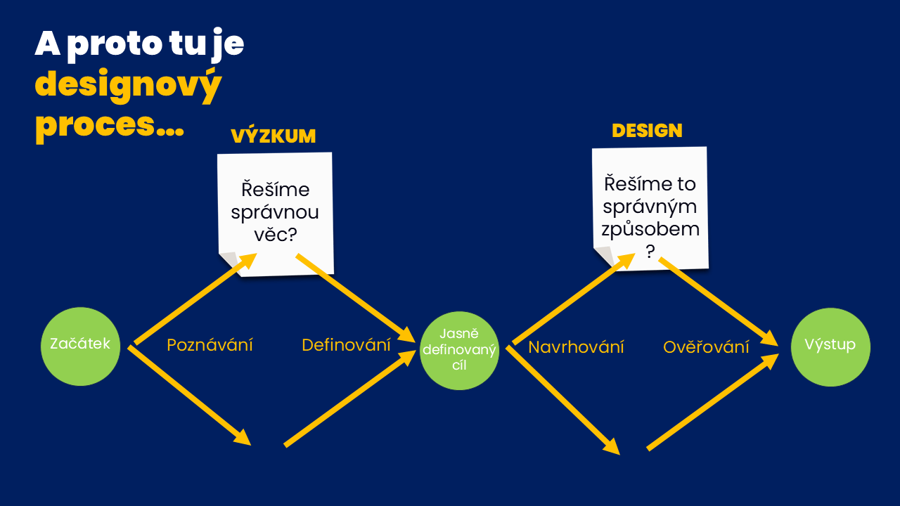 A proto tu máme designový proces, abychom porozuměli potřebám lidí, poznali problém do hloubky. Dvojitý diamant jsem zjednodušené rozdělil na výzkumnou část v jeho první polovině a otázkou, zda řešíme správnou věc a designovou část v polovině druhé a otázkou řešíme to správným způsobem?