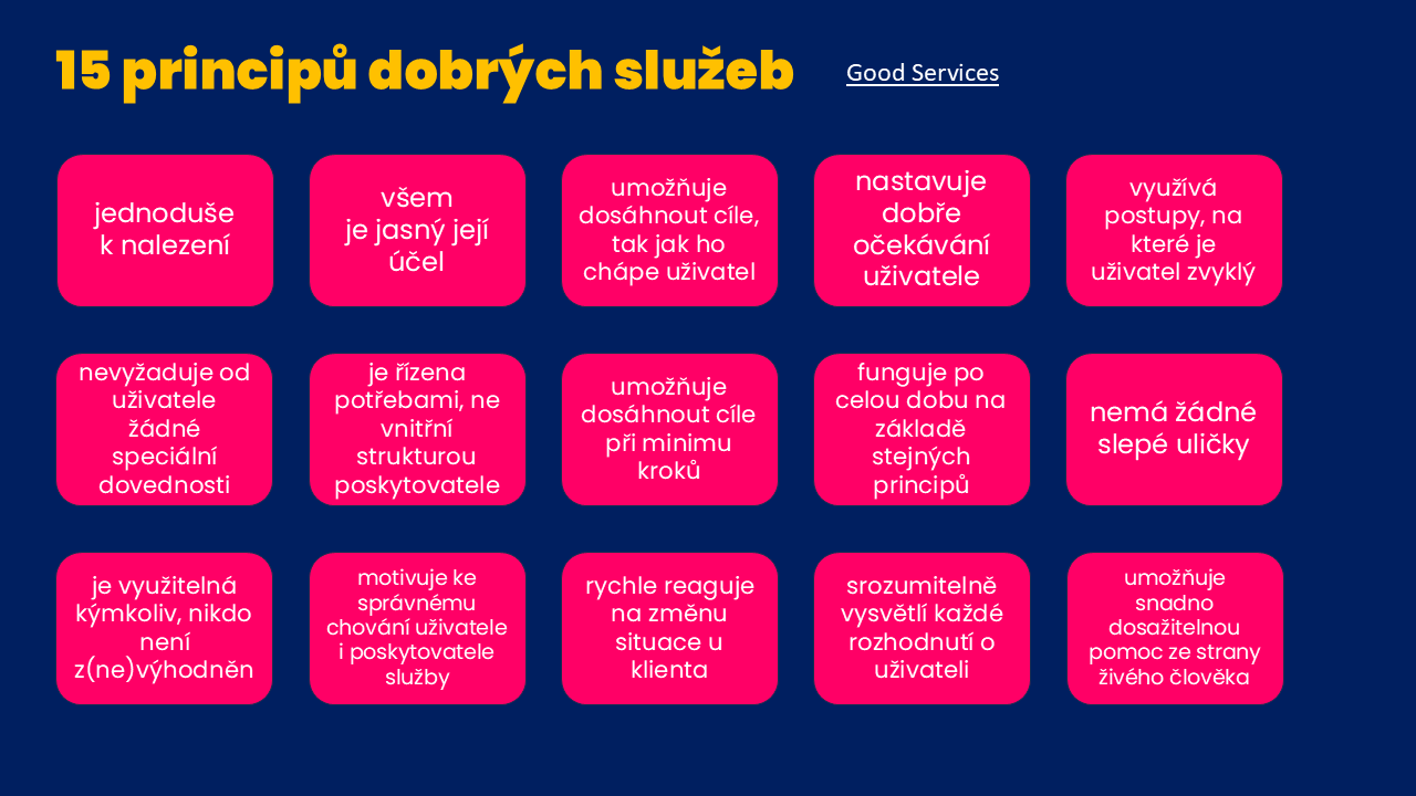 Aktivitu jsme uzavřeli tím, že stejně jako my někdy nerozumíme službám, které využíváme, tak i služby, které poskytujeme pro druhé mohou být nesrozumitelné. My podobě služby rozumíme, protože je to naše služba a jsme s ní denně v kontaktu, ale vždy bychom si měli vzpomenout na vlastnosti špatných služeb, co v nás vyvolávají a v našich službách tomu předcházet. Proto jsme si představili princip dobrých služeb dle Good Services jako rychlý check-list k přemýšlení o našich sluřbách.